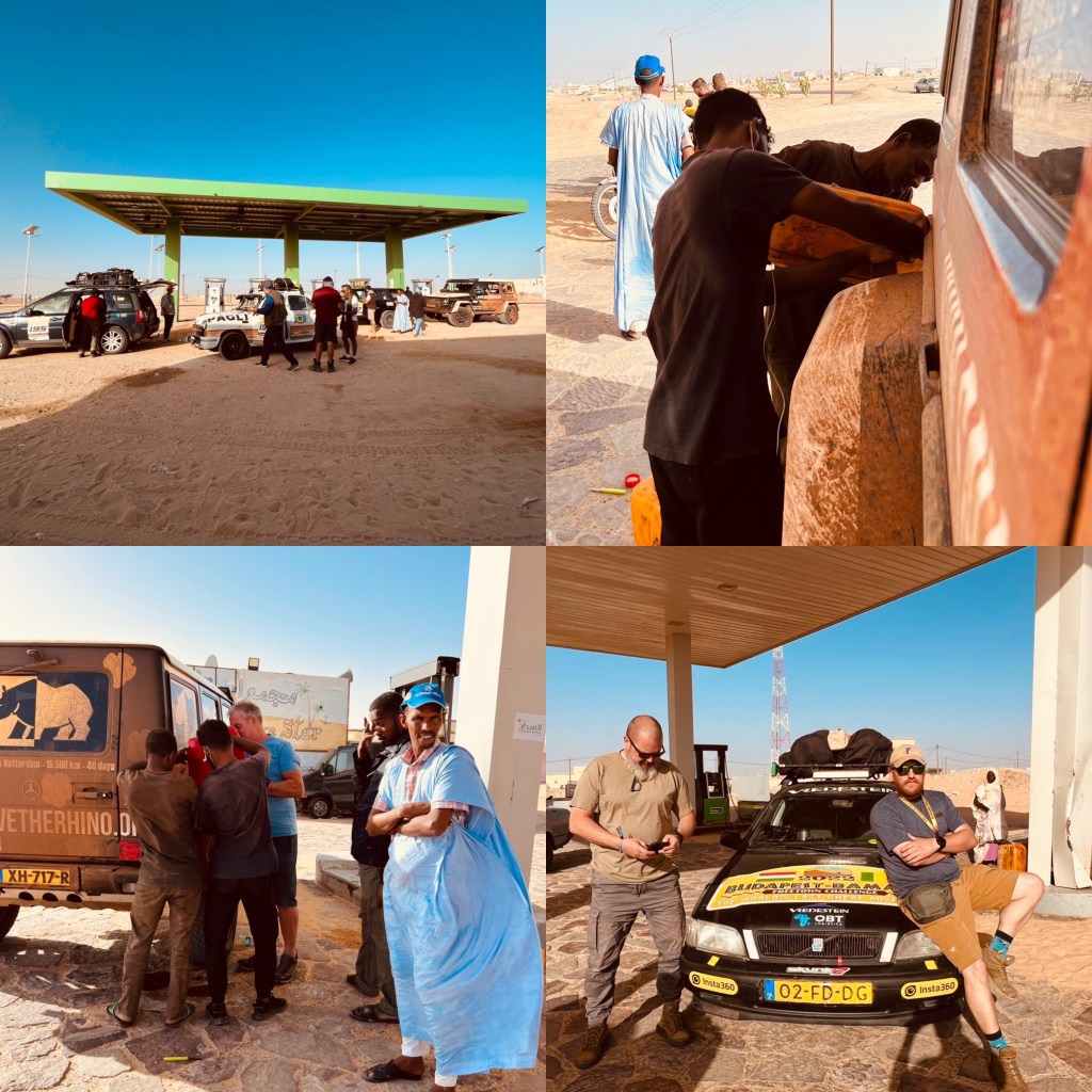 Door deze caravan van auto’s en motoren, is de Benzine op, bij de enige 2 pompen op de route naar de grens. Wij hebben 14.000 km met 80 liter in de auto rondgereden voor noodgevallen, maar deze in Dakar in de tank gegooid, omdat vanaf hier overal benzine goed verkrijgbaar is!