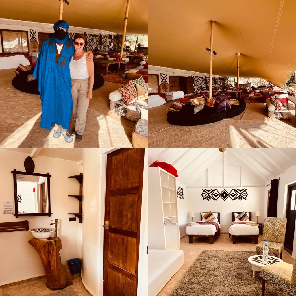 Wij slapen in een luxe tentenkamp midden in de duinen. Er zijn al een aantal Challengers en ik word welkom geheten door een “Touareg” in een blauwe jurk met hoofddoek. Ik zie meteen dat het Eric van Belinda is, hoe zie je dat nu, vraagt hij met zijn Twentse accent! 😉. Bij nieuw aangekomen Challengers heeft hij gelukkig meer succes. Vanavond worden wij getrakteerd op een Marokkaans buffet en live 🎶