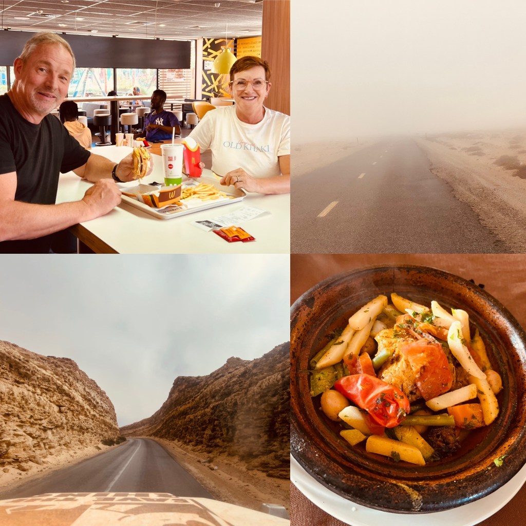 Voor Guilmim nog even tanken en de MB Rhino een broodnodige wasbeurt laten geven met een soort hoge drukspuit. Echt schoon wordt hij er niet van, maar alle tekst is wel weer leesbaar en hij een paar kilo lichter. Een verlate lunch bij het hotel delen wij: Tajine met groente en kip. Superlekker.