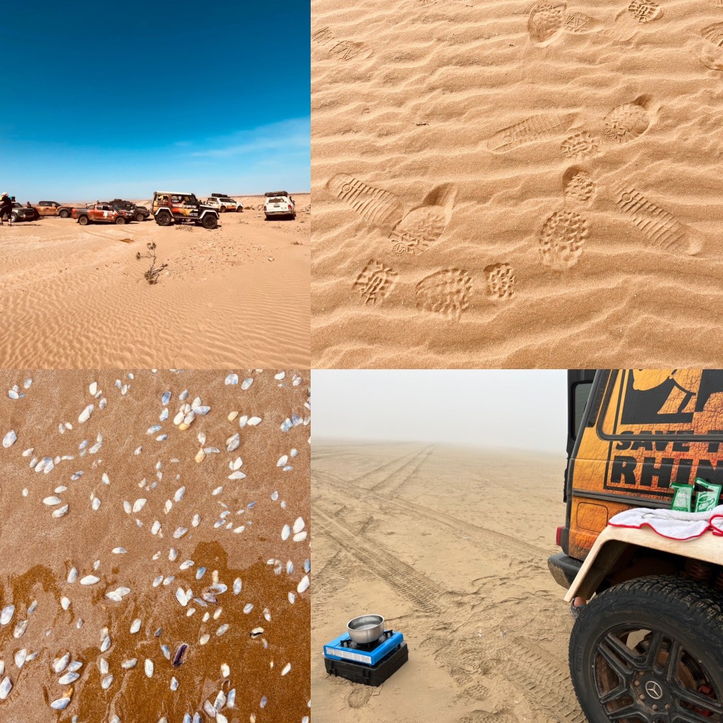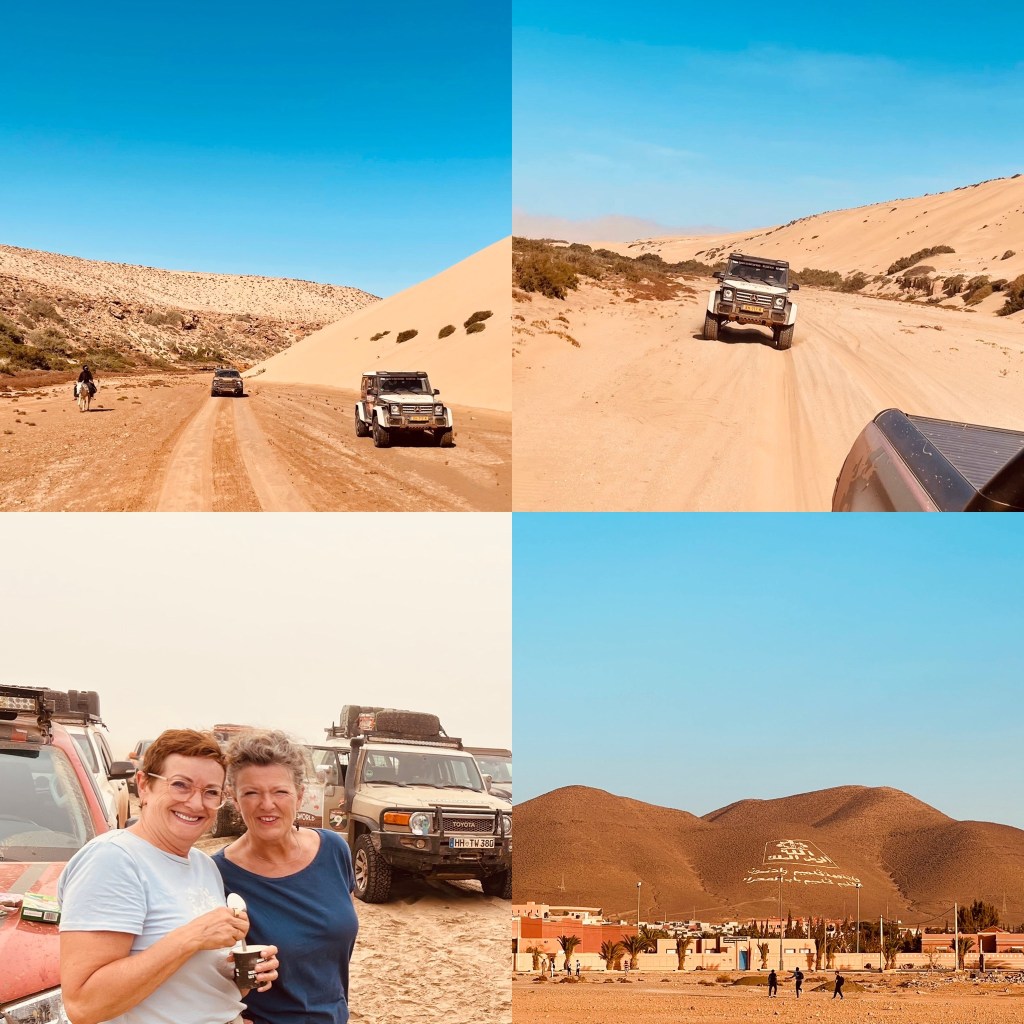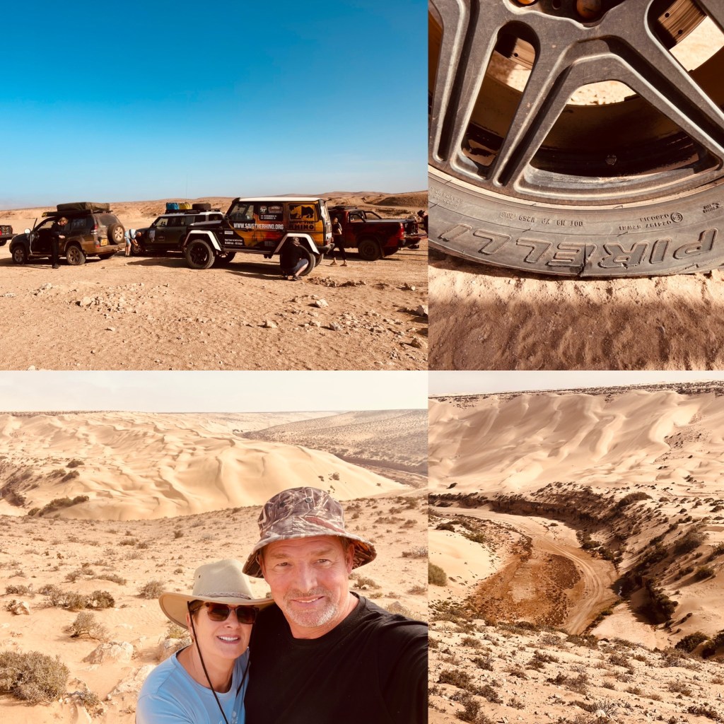 Hele belangrijke woorden/acties vandaag: Zand, Zeevlam, Vastzitten, Lostrekken, en Omgevallen. Bij het aflaten van de banden ziet Peet en klein scheurtje in de rechter achterband, morgen maar even langs de Mercedes dealer in Marrakech ik en ook gelijk de luchtfilters laten vervangen.
