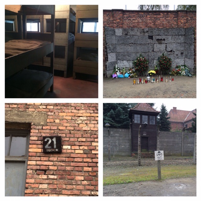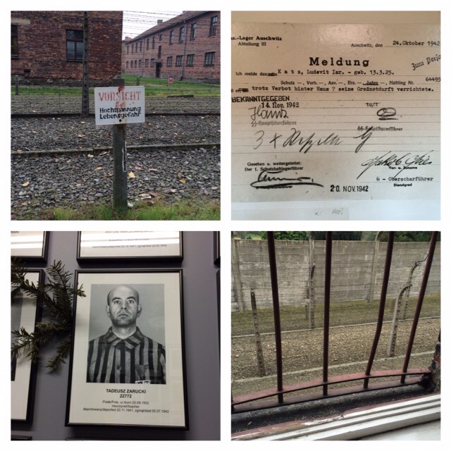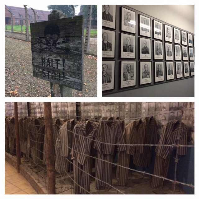 Zo gezegd zo gedaan: wij vetrokken om zeven uur in de regen (mooi weer zou achteraf niet gepast zijn) naar Auschwitz. Wij arriveerden daar (de regen was gelukkig gestopt) inderdaad voor de Japanners. Wel stonden er veel schoolkinderen druk kletsend en lachend met elkaar voor de ingang te wachten op een gids. Wij besloten zonder gids te gaan. Het is heel wat om te zien aan de hand van de foto’s, de zuilen met veel individuele verhalen er op, en de stille getuigen wat er zich hier in de oorlog heeft afgespeeld. Woorden schieten te kort en mijn foto’s spreken voor zich.