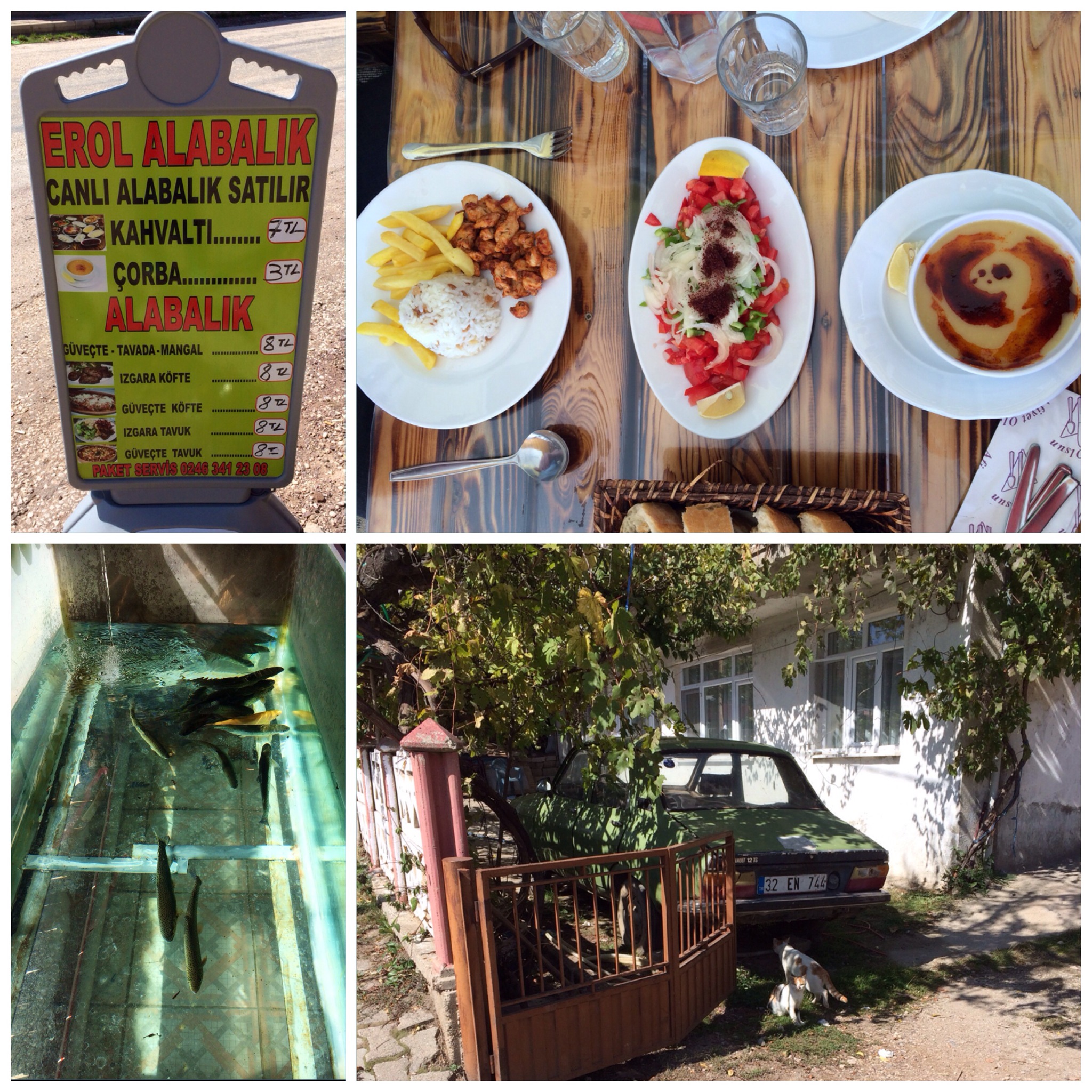 Als lunchlokatie kregen wij als advies: Igirdir of Aksu, het werd Aksu omdat we Igidir nog voor half twaalf doorreden en zijn daarna bij het eerste de beste restaurantje gaan zitten. De oudere dame en, waarschijnlijk haar kleinzoon, keken ons nogal vreemd aan, toen wij met handen en voeten probeerden uit te leggen dat we wilden lunchen en wezen uiteindelijk naar een bord wat voor de deur stond toen wij om een menukaart vroegen. Aan een andere tafel zat een dame met haar vader die bleek een beetje Engels te spreken en kwam in haar, Little Black Dress op torenhoge hakken (ik dacht hoezo overdressed, want dit was een bergdorp waar zolang wij daar aan tafel zaten zaten, naats een paar auto’s ook een tractor, een paar boeren op een brommetje, een kip en een poes voorbij kwamen) ons te hulp en adviseerde om de vis te bestellen, want die had zij daar gisteren ook gegeten en was heel vers. Ze wees naar een aquarium waar een aantal vissen in rondzwommen. Wij hadden eigenlijk niet zo’n trek in vis en bestelde de soep voor mij en het onderste plaatje van de kaart voor Peter.