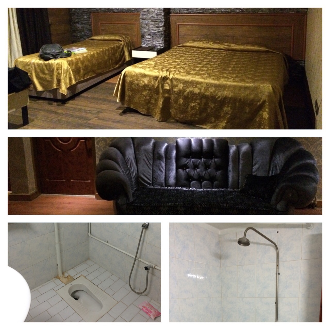 Nette lobby, beetje kitsch en kunst, tot zover alles ok. Ook supersnel internet. Daarna naar de kamer met een ouderwetse sleutel met ons kamernummer 404 aan een hanger. Tot nu toe in elk hotel met een sleutelCard. En wat bleek wij zouden hier de zwaarste etappe krijgen. Gelukkig blijven wij hier maar 1 nacht. (De bank stond trouwens op de gang)
