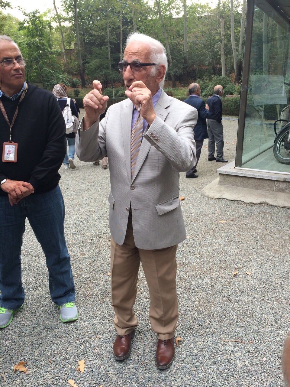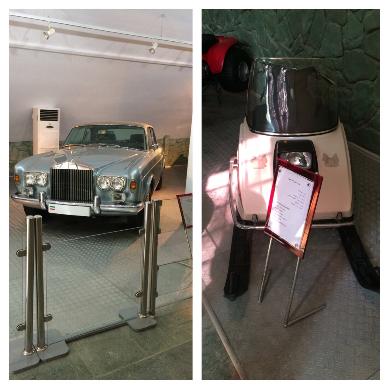 Vandaag stappen wij na het ontbijt in een minivan om een dagje Teheran te doen met onze Iraanse gids Hossein. In de lobby nemen we vast afscheid van Koen van team Smits, en overtreden Sandra en ik weer de regels en door hem een hand en drie zoenen te geven. Onderweg naar onze 1e stop, het paleis van de 1e Shah van Perzië wat nu een museum is, vertelt Hossein het één en ander over Iran. In het kort: langste boulevard in Teheran = 25 km, waarlangs 90.000 Platanen staan. 72 miljoen inwoners in Iran, 17 miljoen in Teheran overdag en 9 miljoen in de avond, 3 miljoen auto’s. hoogst gemeten temp in woestijn 71 gr en – 38 laagste temp. Teheran ligt in een aardbevingsgebied en binnen nu en …. komt er een grote verwoestende aardbeving. Ik ben blij dat wij morgen naar Isfahan gaan. Inmiddels zat Peet met zijn ogen dicht, en toen iemand hem zeij dat dit niet netjes naar Hossein is, zeg hij “dit is Japans luisteren, die doen dat allemaal tijdens een excursie”. Aangekomen bij het S’ad Abad museum moeten wij via een best wel lange oprijlaan omhoog lopen. Eerst naar het automuseum. Foto’s mogen er niet gemaakt worden, en daar komt mijn, bij de challengers inmiddels ook beruchte iPhone 5, wel weer van pas, geluid op stil en …. Ik bega mijn 2e overtreding van vandaag….