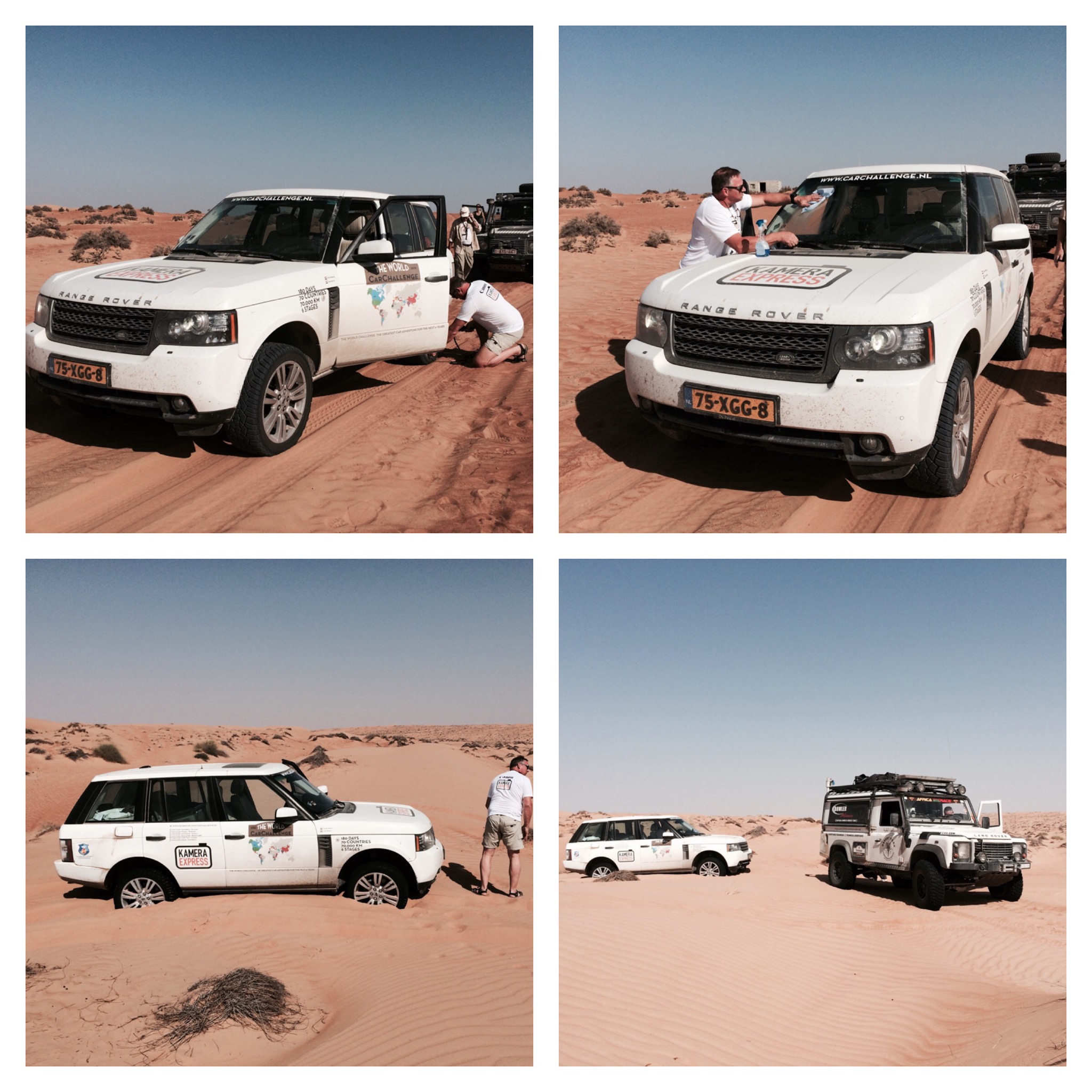 De wekker ging om half zeven en ontbijten we weer eenvoudig. Joe (alias Mr. Bean) van team tosti 1 feliciteren wij met zijn verjaardag. En Elly zorgt voor overheerlijk kopje Nespresso (de Zeurende Oostenrijker van gisteren, schudt zijn hoofd, en weet t nu zeker, de Hollanders zijn deze plek niet waard). Onze Gids voor vandaag, blijkt een rallyrijder te zijn en Peet en ze laten elkaar trots de verschillende rallyauto’s zien. Het parcours is ongeveer 150 km ook met duinen erbij. Het 1e gedeelte gaat de RR goed af, het autocorrigende systeem op de wielen was uitgezet en dat werkte goed. Bij een, zo leek wat hogere duin, probeerde Peet er links omheen te sturen. Maar de snelheid was te laag laag door de draai en groeven de wielen zit vast in het zand. Team Wouter en Sigi trokken ons snel weer los. Er volgde weer een gedeelte zandweg en reden zo een aantal kilometers door het mooie zandlandschap.
