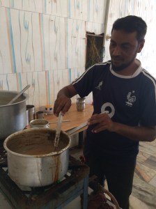 Rond 11:30 stoppen we voor een koffie en theepauze en misschien een vroege lunch. Maar als wij zien hoe de koffie en thee gemaakt wordt besluiten we het bij de koffie en thee te laten en hopen we dat we er geen onrustige darmen van krijgen.