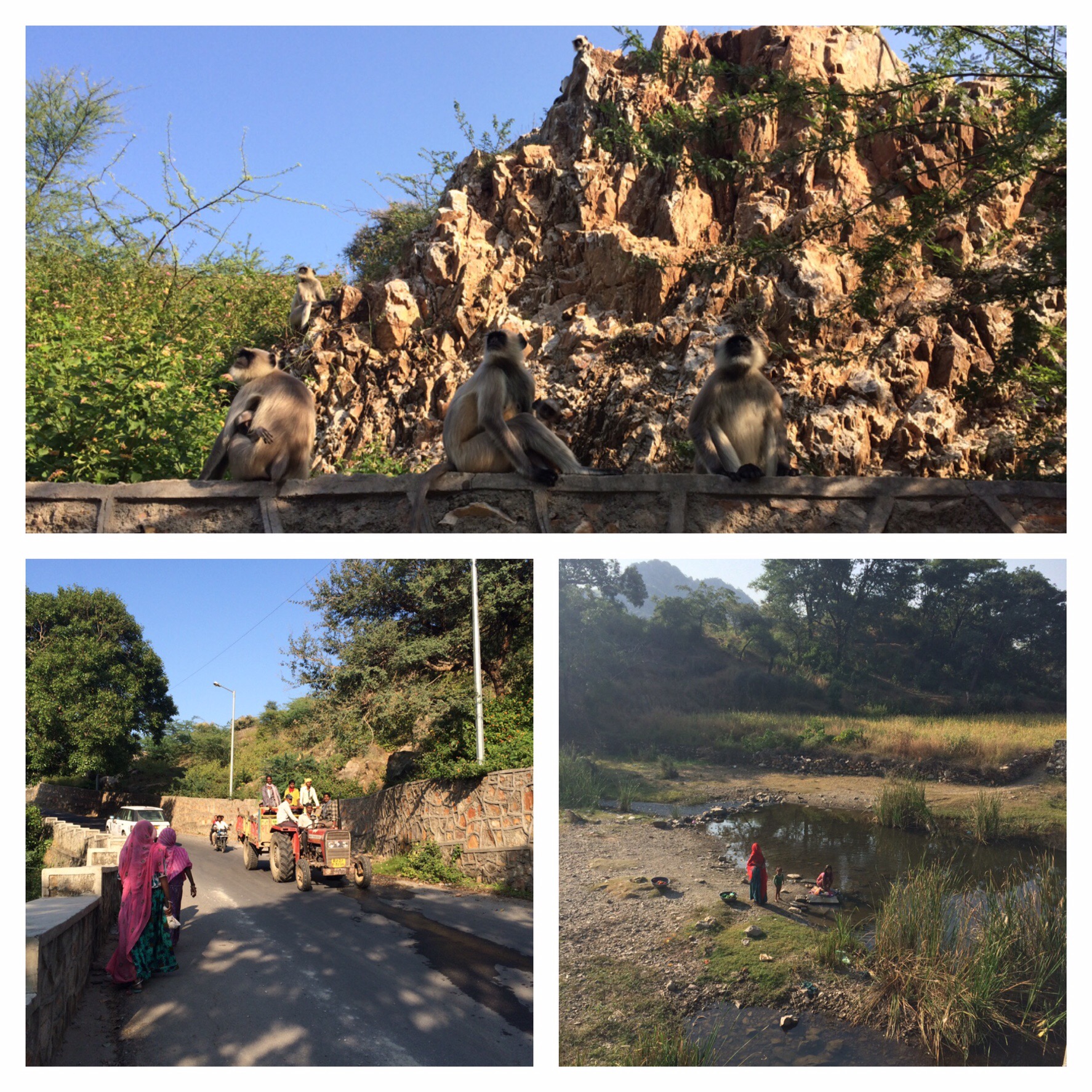 Gaandeweg wordt de lijst van dieren die we onderweg spotten steeds groter van: koeien, honden, kamelen, olifant, pauwen, zwijntjes, waterbuffels en nu dus ook apen.