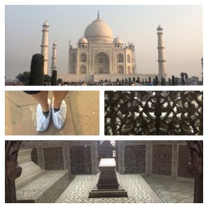 Wij worden er stil van, want de Taj is echt prachtig, helemaal opgetrokken uit wit marmer en versierd en ingelogd met edelstenen. (De papieren slofjes krijgt iedereen aan die het mausoleum van binnen wil zien)