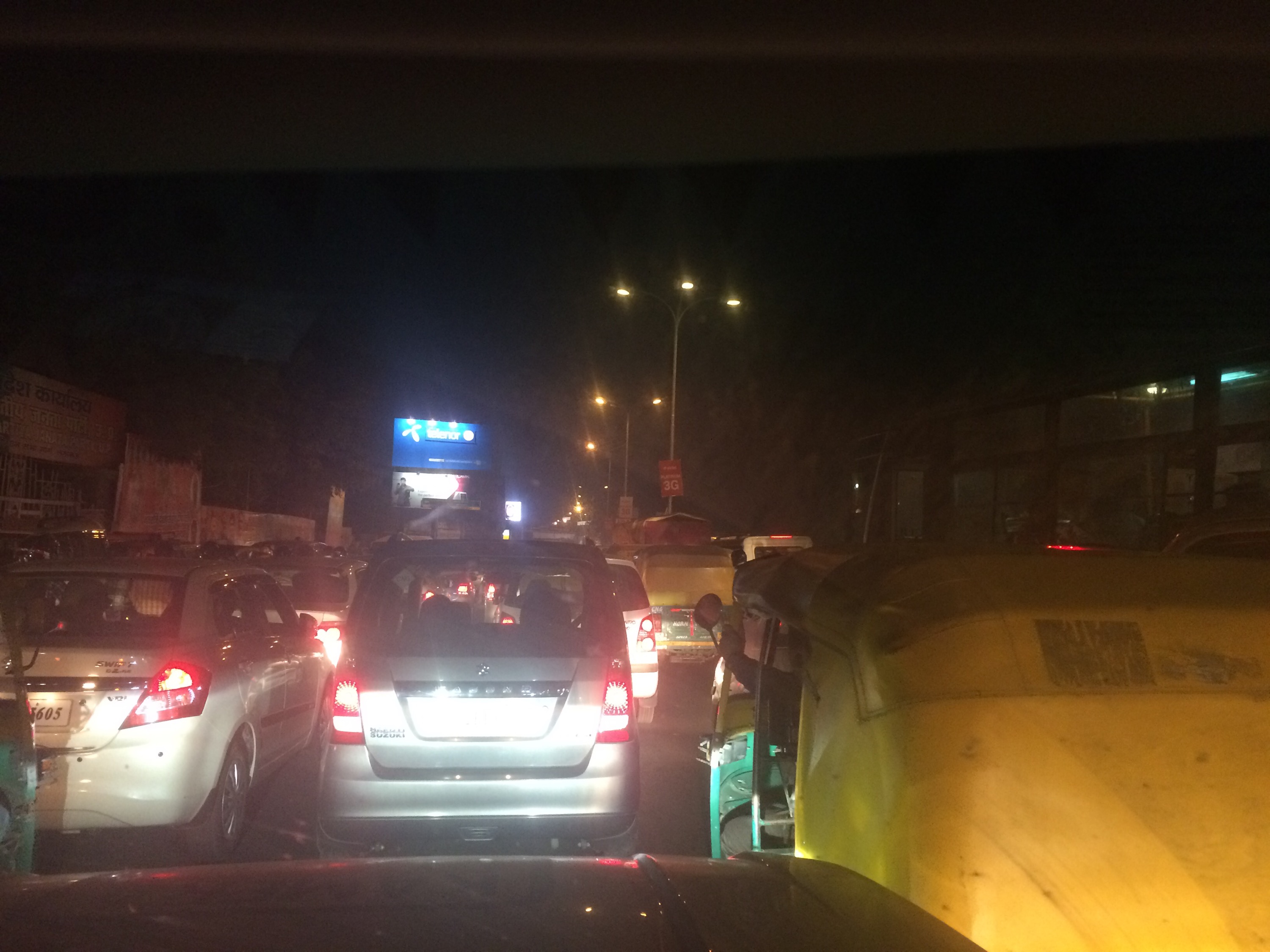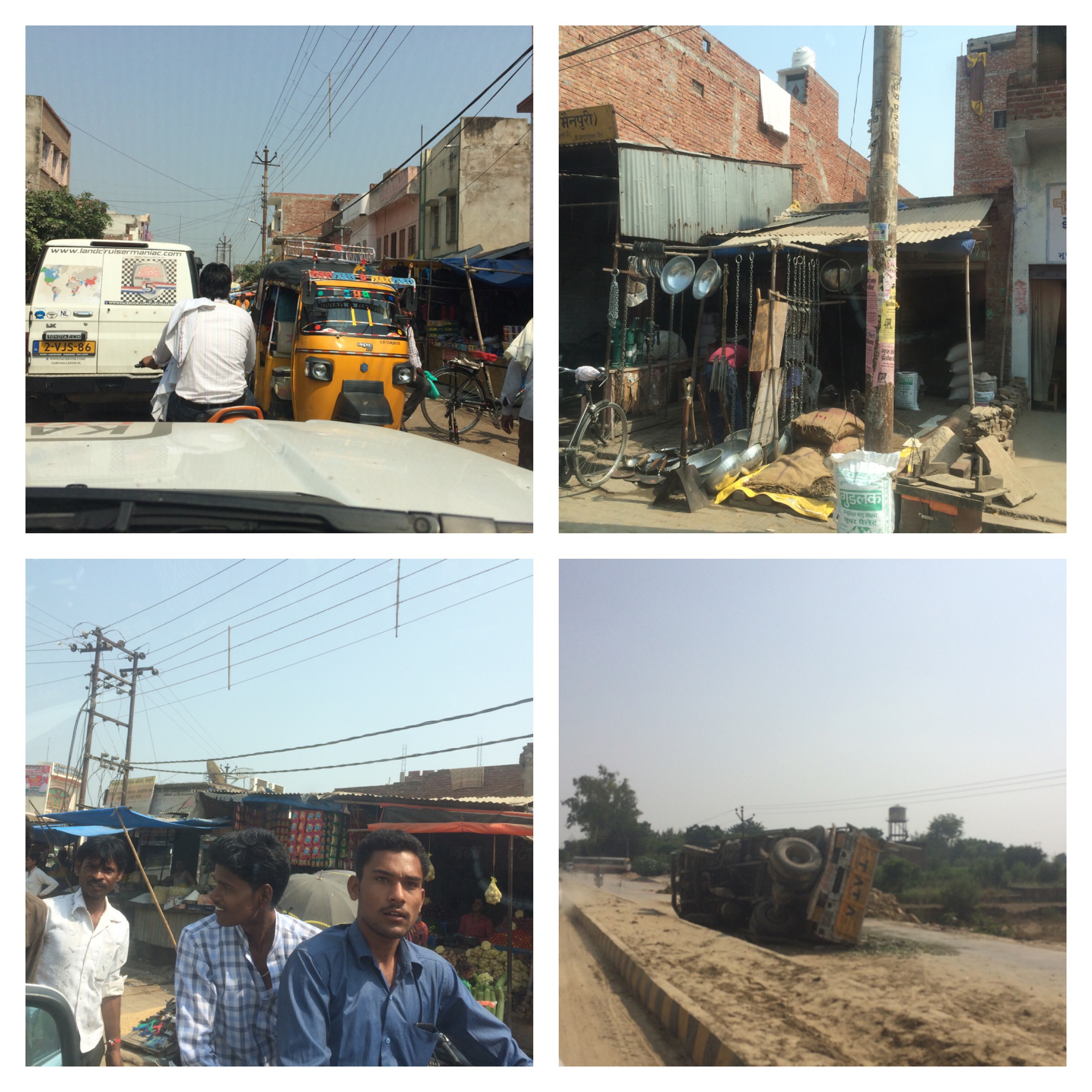 Als we door het volgende dorp rijden en iemand druk gebarend wijst dat we terug moeten zien we 1km later wat hij bedoelde, de brug over de rivier is weg en we keren , om dan zonder wegen op de iPad alleen de pijl laat zien waar we rijden. Uiteindelijk komen we weer op onze route uit. Rijden met schemer Lucknow binnen, wederom is er een weg afgesloten moeten terug en komen in een vreselijk verkeersinfarct terecht. Inmiddels wordt het donker maar er is overal licht van de winkels of fly-over die ze hier aan het aanleggen zijn. Dan raakt Kwik licht onze achterbumper maar tijd om te checken of we schade hebben is er niet, en zien er het wel als we in het Hotel aankomen.
