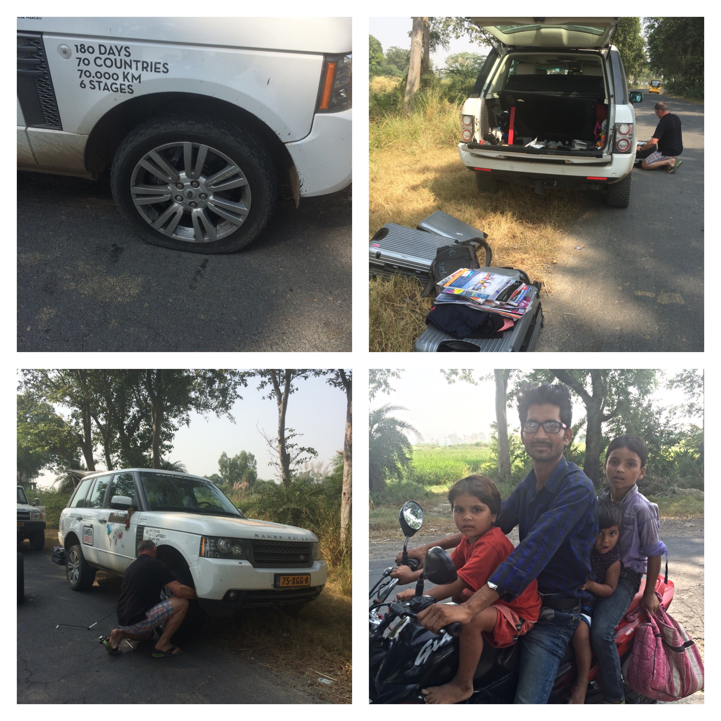 En terwijl we net vinden dat er een mooie asfaltweg is aangelegd stopt deze na 2 km om te veranderen in een middeleeuws exemplaar met gaten zo diep als een gemiddelde waterput en dan hebben we een flinke de RR krijgt een behoorlijke opdonder en rechtsvoor hebben we een lekke band. Het reserve exemplaar ligt in de kofferbak onder alle bagage, dus bagage eruit, wiel wisselen. Kwik komt terugrijden want die vond ons toch wel erg lang wegblijven, alles weer in de auto, de velg blijkt aan de binnenkant flink krom en waarschijnlijk is de band niet lek.
