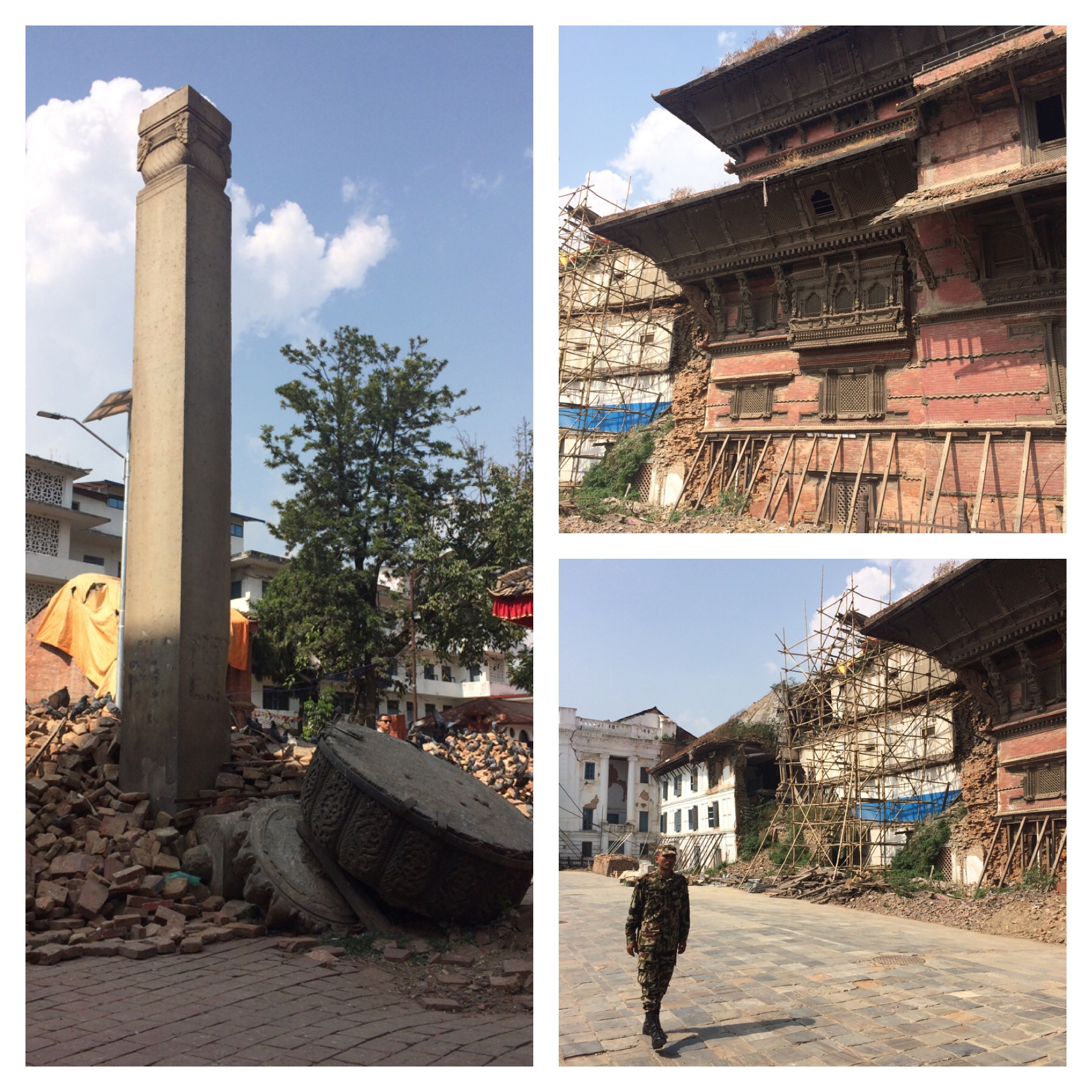 De gids brengt ons naar het grote plein van Katmandhu waar we tegen betaling 1000 Nepaleese roepies op mogen. Hier zijn de eerste gevolgen van de aardbeving voor ons zichtbaar. Er zijn eeuwenoude tempels verwoest en de rotzooi ligt er nog en wij denken dat get er over 100 jaar nog zo bijligt.