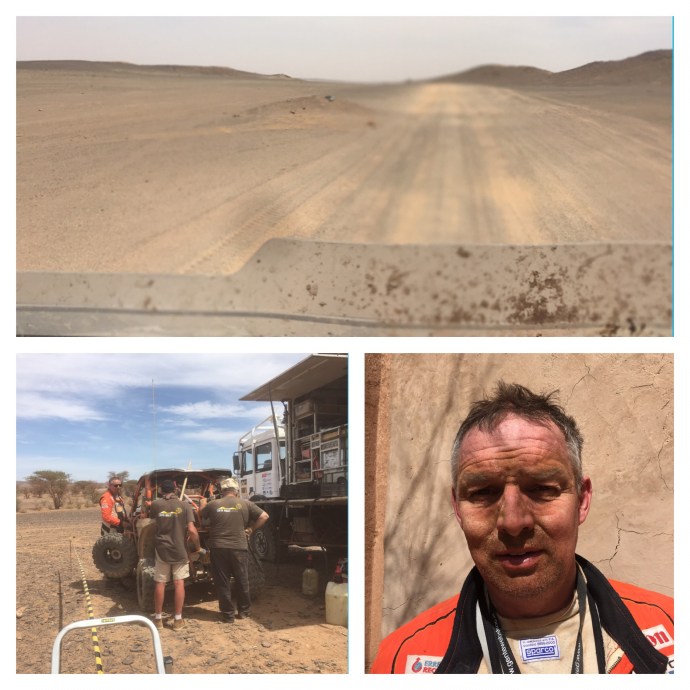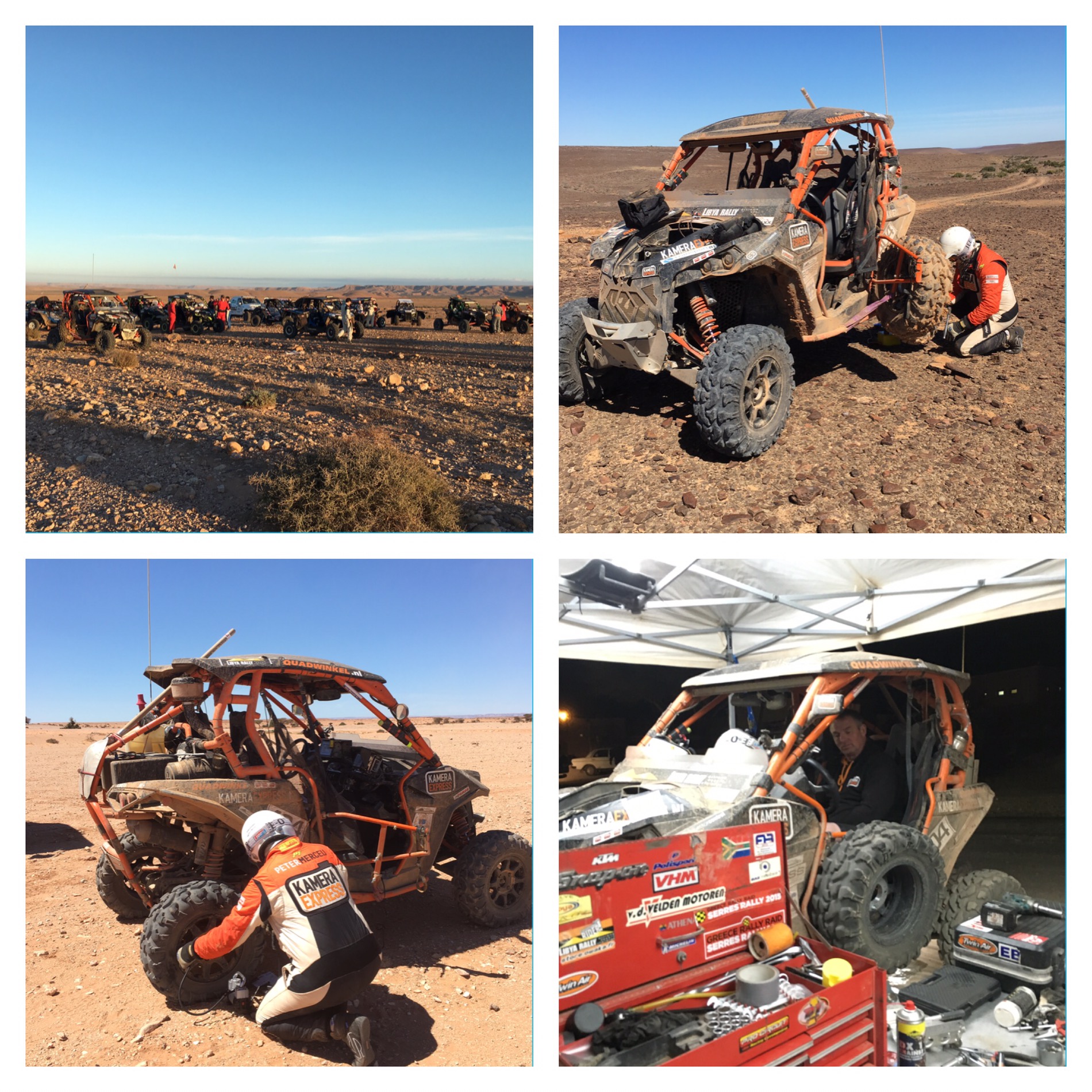 De langste etappe staat ons vandaag te wachten. Dus wekker gaat om zes uur (waarom ik die zet weet ik niet) want slapen in een tentje naast de werkplaats van het team is niet bevordelijk voor mijn nachtrust. Snel een broodje naar binnen 45 km verbinding en wat zijn we blij als het 1e waypoint geklokt wordt na de start. Het klopt vandaag als een bus op de lange 485 km klokken we ze allemaal. Maar scherpe stenen zijn ook voor ons, wat resulteert in 3 lekke banden na een aantal pogingen om ze met de compressor hard te houden moeten we er zelfs 1 met een prop dicht zetten en hopen dat het houd. Ook hebben we extra benzine mee maar dat blijkt gelukkig niet nodig. Vanaf km 150 op de proef meld Peter dat de remmen weigeren. Stoppen is absoluut geen optie dus rijden we ‘gewoon’ de hele etappe zonder remmen, en door de stuurmanskunst en ervaring van Peter gaat dit gelukkig super. Het navigeren (op 1 misrekening naar een wp) ging ook goed, en hebben we de langste etappe de SSV door heel afwisselend terrein (met prachtige tafelbergen, wel 10 tegelijk naast elkaar, daar valt die ene in Kaapstad geheel bij in het niet) door veel oueds over eindeloos uitgestrekte vlaktes, zandpaden, heelhuids naar de finish gereden. Daar hoorden we dat er onwijs veel banden zijn gesneuveld en er veel deelnemers met pech stonden of al zijn uitgevallen. Wij kunnen morgen weer fris en fruitig (of toch niet helemaal) en mijn wekker kan uit ik schrijf dit nu om 04:53 terwijl Peter in het tentje naast mij heerlijk een bos aan het omzagen is En de aggregaat van de buren vrolijk staat te draaien ..!