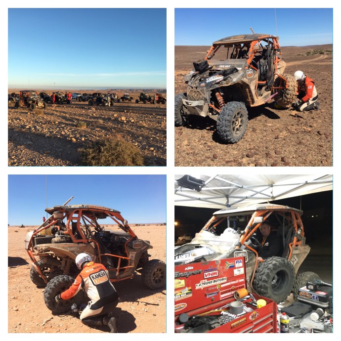 Na een spectaculaire start vanaf het strand was het 25 km racen over het strand wat echt tof was, het 1e wp lag op een rare plek in de duinen, een aantal motoren en quads waren aan t ploeteren wij probeerden t door de duinen in te rijden te halen maar dit lukte ook niet (dat begon al goed 1e wp slippen) dit blerk de rode draad voor de rest vd route . Na 15 min in de oued (lees rivier) trakteerde peet ons on op douche en de SSV en wij al gelijk drijfnat. We webben nog verwoede pogingen gegaan (net als alle deelnemers) om wp’s te zoeken maar die bleken door een fout verkeerd geprogrammeerd te zijn en lagen buiten de route. Doordat gezoek en (lichtelijk gevloek) kwamen wij 20 km voor de finish zonder brandstof te staan en kregen gelukkig een ligt vd servicemannen van Ginaf. Deze 20 km zijn wij bijna gestenigd daar het wegdek bestond uit zwarte steentjes die als onderlaag voor nieuw asfalt dienen. Gelukkig is er etappe geneutraliseerd en begint de 2e vndg in dezelfde volgorde. Het is de langste etappe vd rally en we moeten voor dag en douw op. En niet 2x bijtanken vandg want de SSV verbruikt behoorlijk wat 1 op 4,