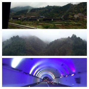 Ik maak een paar “snelwegfoto’s” en daar zal het wel bij blijven vandaag tijdens deze monsteretappe over de Expressway met druilerig weer en 12 graden. We krijgen een soort wintersportgevoel, want als we onderweg naar Oostenrijk (afstand ongeveer gelijk) regen hebben vragen we ons altijd af, zou er sneeuw liggen in ons geval, hoe dik zou de stoflaag zijn in Nanchang.