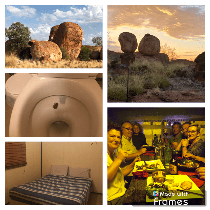 Het diner is ook weer heerlijk en wij besluiten dit keer buiten op het balkon onder de sterrenhemel te gaan slapen. Op het bed staat nog een heerlijk afzakkertje. Na een halfuurtje voel ik een paar druppels. Peet is inmiddels binnen gaan liggen want dat matras is veel zachter dan buiten. Midden in de nacht gaat her echt druppelen en verhuis ik ook weer naar binnen. De laatste excursie vandaag slaan wij even over om de bagage even te reorganiseren en na her ontbijt vertrekken weer richting Marja’s Travellers rest 520 km naar Zuid Australië.